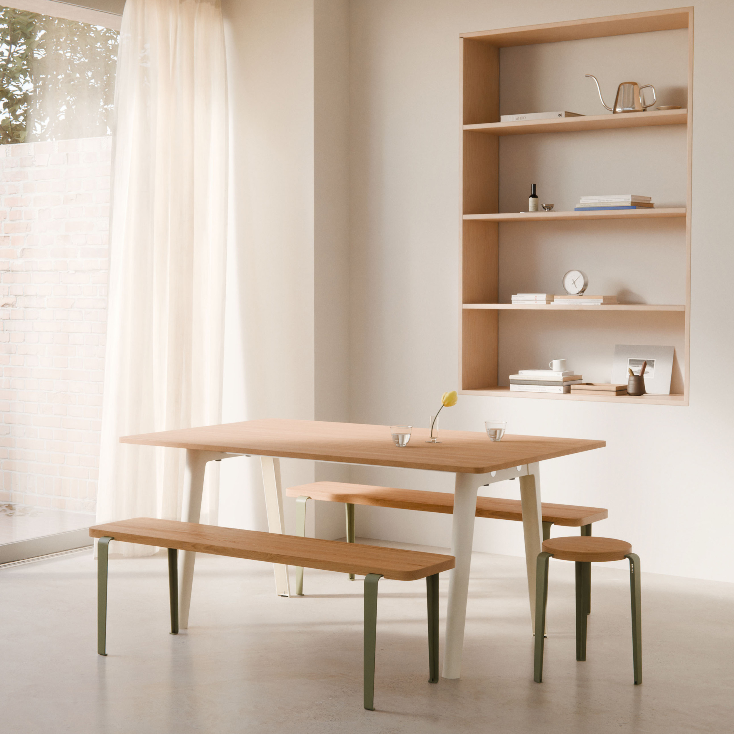Composé d’un plateau en bois – chêne massif ou hêtre teinté – et d’un piètement en acier thermolaqué, il se décline en version simple ou bicolore pour une touche d’originalité.